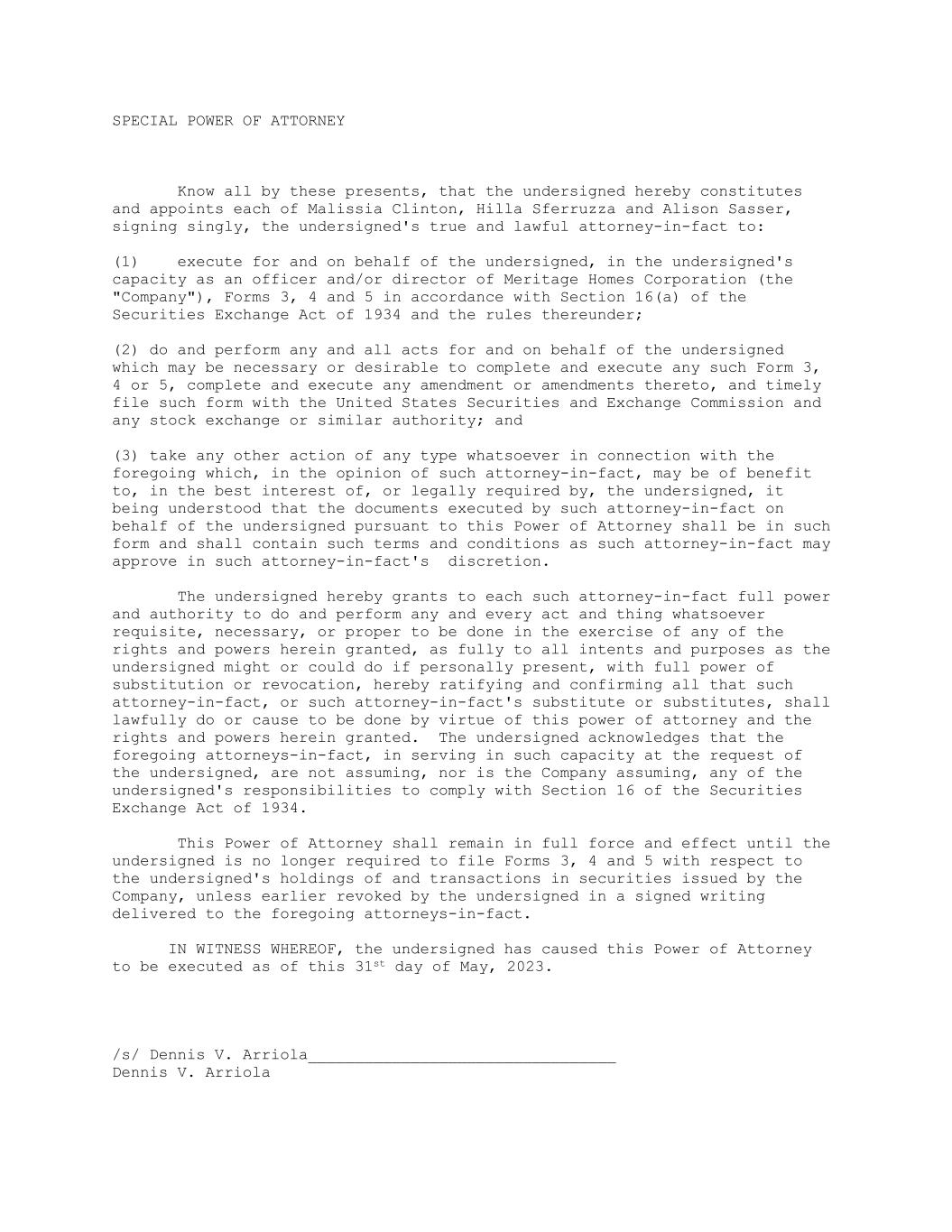 SPECIAL POWER OF ATTORNEY Know all by these presents, that the undersigned hereby constitutes and appoints each of Malissia Clinton, Hilla Sferruzza and Alison Sasser, signing singly, the undersigned's true and lawful attorney-in-fact to: (1) execute for and on behalf of the undersigned, in the undersigned's capacity as an officer and/or director of Meritage Homes Corporation (the "Company"), Forms 3, 4 and 5 in accordance with Section 16(a) of the Securities Exchange Act of 1934 and the rules thereunder; (2) do and perform any and all acts for and on behalf of the undersigned which may be necessary or desirable to complete and execute any such Form 3, 4 or 5, complete and execute any amendment or amendments thereto, and timely file such form with the United States Securities and Exchange Commission and any stock exchange or similar authority; and (3) take any other action of any type whatsoever in connection with the foregoing which, in the opinion of such attorney-in-fact, may be of benefit to, in the best interest of, or legally required by, the undersigned, it being understood that the documents executed by such attorney-in-fact on behalf of the undersigned pursuant to this Power of Attorney shall be in such form and shall contain such terms and conditions as such attorney-in-fact may approve in such attorney-in-fact's discretion. The undersigned hereby grants to each such attorney-in-fact full power and authority to do and perform any and every act and thing whatsoever requisite, necessary, or proper to be done in the exercise of any of the rights and powers herein granted, as fully to all intents and purposes as the undersigned might or could do if personally present, with full power of substitution or revocation, hereby ratifying and confirming all that such attorney-in-fact, or such attorney-in-fact's substitute or substitutes, shall lawfully do or cause to be done by virtue of this power of attorney and the rights and powers herein granted. The undersigned acknowledges that the foregoing attorneys-in-fact, in serving in such capacity at the request of the undersigned, are not assuming, nor is the Company assuming, any of the undersigned's responsibilities to comply with Section 16 of the Securities Exchange Act of 1934. This Power of Attorney shall remain in full force and effect until the undersigned is no longer required to file Forms 3, 4 and 5 with respect to the undersigned's holdings of and transactions in securities issued by the Company, unless earlier revoked by the undersigned in a signed writing delivered to the foregoing attorneys-in-fact. IN WITNESS WHEREOF, the undersigned has caused this Power of Attorney to be executed as of this 31st day of May, 2023. /s/ Dennis V. Arriola_________________________________ Dennis V. Arriola
